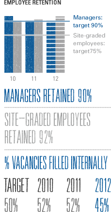 Employee retention is one of our key measures and we have set ourselves a target of 90% for managers and 75% for our site-graded employees. For the fourth year in a row we have hit or exceeded our targets, achieving retention rates of 90% for managers and 92% for site-graded employees in 2012.